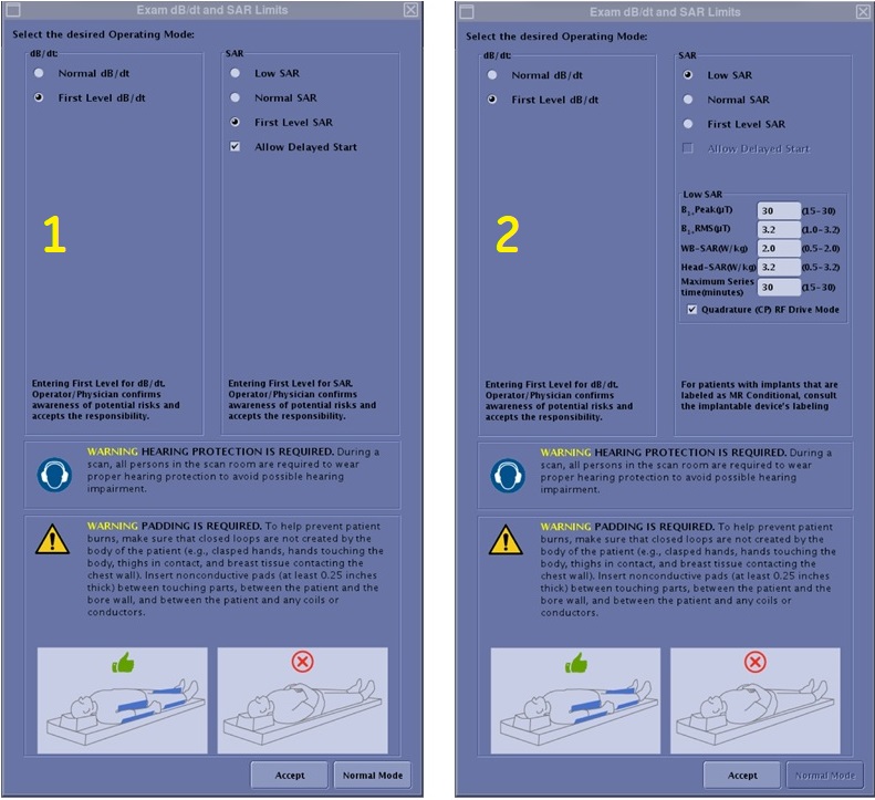 • The Low SAR option cannot be changed once an exam begins. The other SAR modes retain normal behavior in that they can be moved up; for example, you can move from Normal mode to First level mode within an exam.