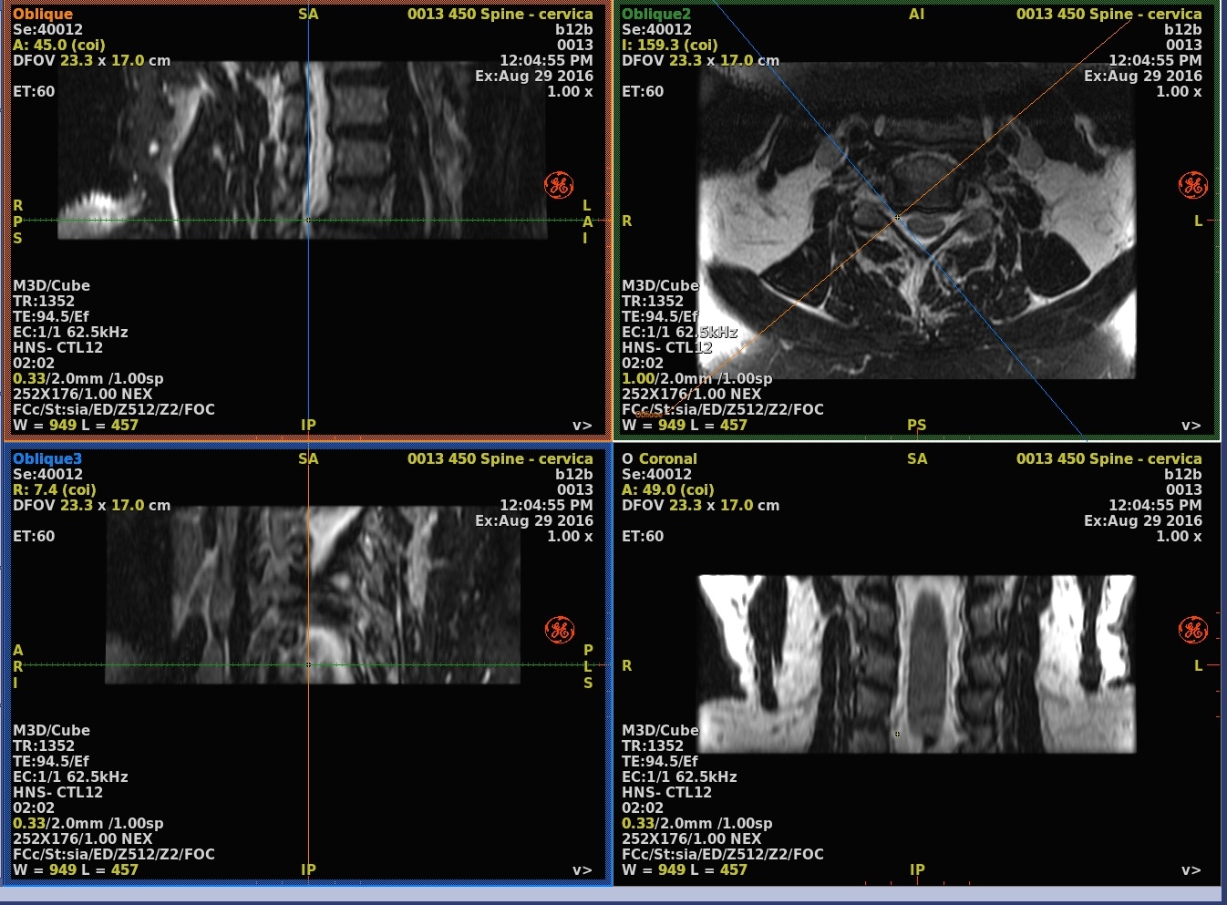 A baseline view is a basic axial, coronal or sagittal view. Of these, the acquisition view displays the images in the acquisition plane of the original image set, the other two are the corresponding orthogonal reformatted views. They can be moved to show any location in the 3D volume, but remain aligned parallel to the three main axes of the RAS coordinate system. An oblique view is a plane reformatted view that can be both moved and rotated to any location and orientation within the 3D volume.