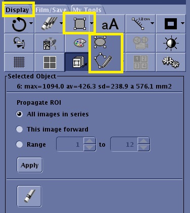 Use these steps to activate an ROI to obtain information on the standard deviation, mean, and area. The ROI statistics are displayed in the lower-right corner of an image. Up to three statistics can be displayed.