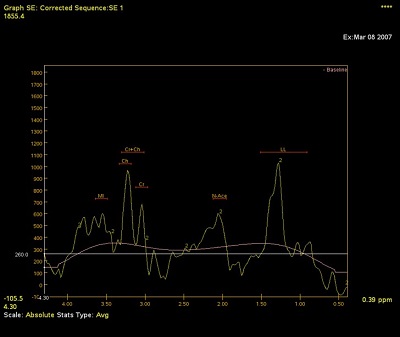 Click the 3D ROI cursor center and move the ROI within the area of the highlighted spectroscopy voxels and note that the graph does not change.