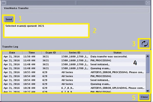 4. From the ViosWorks screen, click Send to activate the transfer process to Arterys.