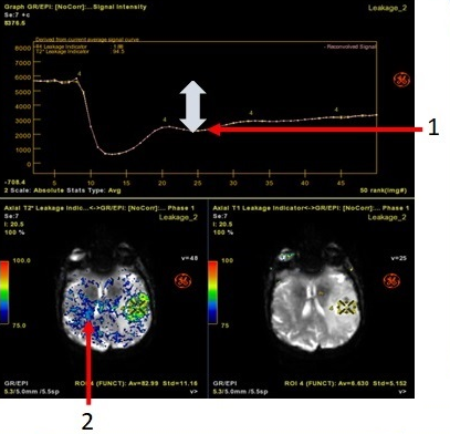 Table 1. Image legend Number Description 1 T2* Leakage Indicator graph shows where the post-bolus stays below the baseline level. 2 T2* Leakage Indicator map. Figure 3. T1 Leakage Indicator graph and map