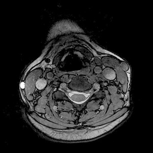 Use these steps to acquire 3D axial C-spine images. The k-space filling technique used with COSMIC improves the CNR and SNR of C-spine tissue, including the spinal cord, vertebral disks, nerve root canal, and contrast between CSF and nerve roots. 3D COSMIC images improve depiction of osteophytes and foraminal nerve roots. It produces a mixed T2, T2/T1 image contrast.
