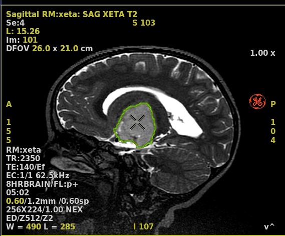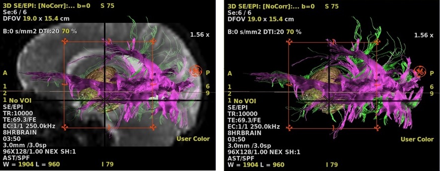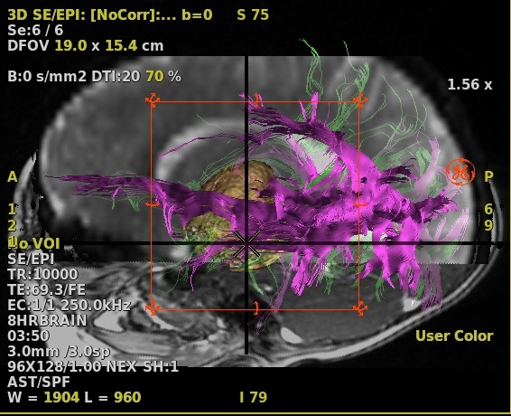- Scroll through the images to locate an image that displays white matter tracts or pathology of interest from which you can deposit ROIs to define the tracts.