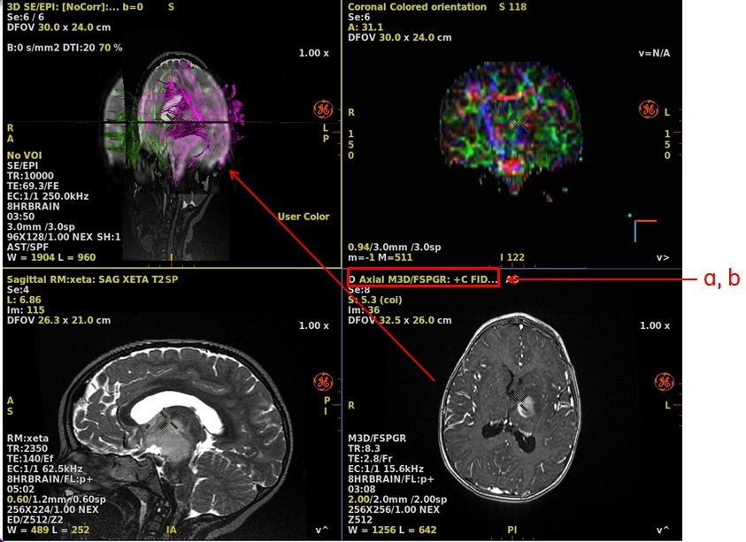 Use these steps to merge many data types to create a new view of the anatomy. In this example, a DTI data set FiberTrak view is merged with the 3D data sets and the pathology of interest.