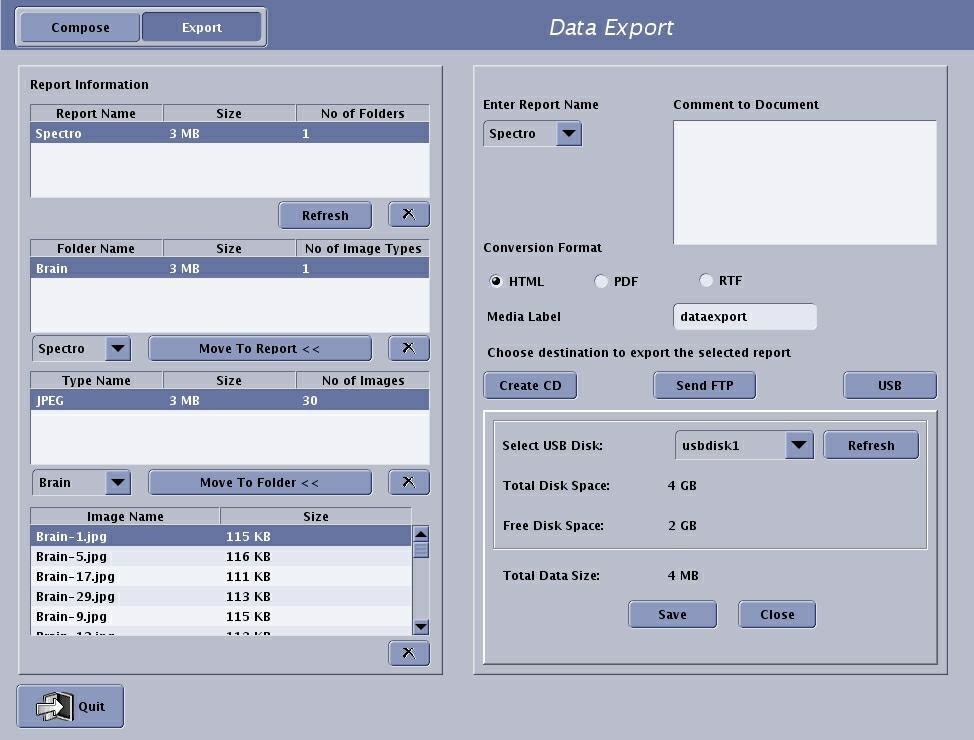If more than one device is inserted into the USB ports, then select from the USB media information area, the device to which you want to send the report from the Select USB Disk menu.