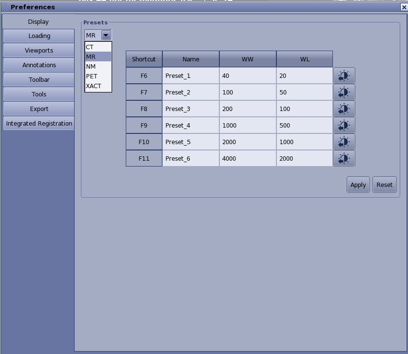 . The WW and WL fields are populated with the W/L of the active viewport. - Click Apply to save the values in the Display Preferences screen.