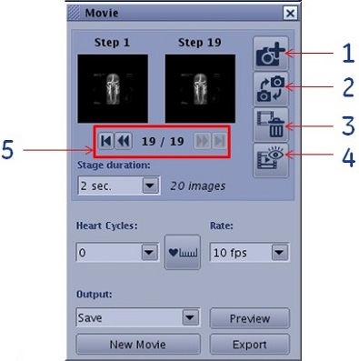 ) to adjust Cardiac Cycle to the actual heart rate.Rate Select a movie frames per second: 2, 5, 10, 15, 20, 25 or 30. Output Select an option from the menu: Film, Save or Film & Save. Preview Click to preview the movie. New Movie Click to create a new movie. Export Click to export the movie to the patient list. - Click the desired viewport of the first image for the movie.