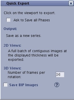 7. Move the cursor over the viewport of interest. For fMRI series, place the cursor over the viewport that displays the source and activation maps. For other series with segmentation contours, place the cursor over the viewport that displays the source and segmentation contour. The cursor changes to a camera. Left-click to activate the Quick Export action.