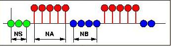 The algorithm used by this protocol computes the correlation between the temporal variations in time course data and a reference pattern that represents the periodic activation during the acquisition. The reference pattern can be different from exam to exam. The pattern consists of the alternation of a series of NA images corresponding to an active state (illustrated by red bullets in the panel), and NB images corresponding to an inactive state (illustrated by blue bullets). The beginning of the pattern may contain a number NS of images to skip (illustrated by green bullets).