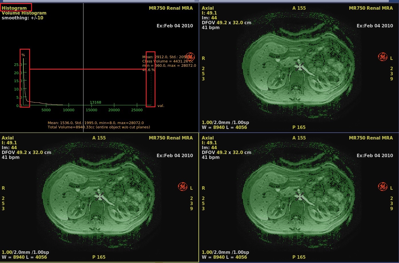 - On the histogram graph, click and drag on the voxel reference line (solid white line) to the area of interest.
