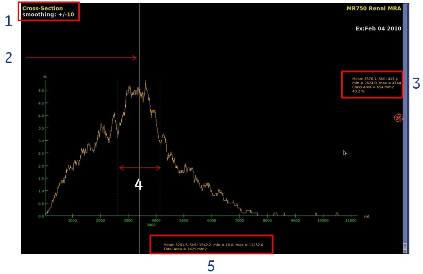 Table 1. Image legend Histogram annotation Description 1. Smoothing annotation The smoothing annotation indicates how the percentage of occurrence values are calculated. If the smoothing value is 0, each percentage-of-occurrence value on the histogram's vertical axis is calculated directly for each voxel value on the histogram's horizontal axis. If the smoothing value is 10, a range of +/- 10 is taken around each voxel point on the histogram's horizontal axis. The values are averaged and this average value is attributed to the voxel point on the histogram's horizontal axis, creating a smoothing effect on the histogram curve. Increasing the smoothing value will tend to even out the histogram and small peaks and valleys will tend to disappear, thereby changing the class boundaries.