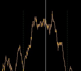 Class boundary lines located on both sides of the center white line, mark the upper and lower limit of a class (range) of voxel values around the voxel reference line whose values are specific to a certain anatomical feature (e.g. bone surrounded by muscle, or a tumor surrounded by healthy tissue). These boundaries are calculated automatically and displayed as green thin dotted lines. You can move them manually to delimit an exact range of voxel values. The software analyzes the peaks and valleys of the histogram curve and determines the voxel class around the current voxel reference line from the changes in slope (the inflection points) of the histogram curve. Set the smoothing value as required before using the class boundaries.