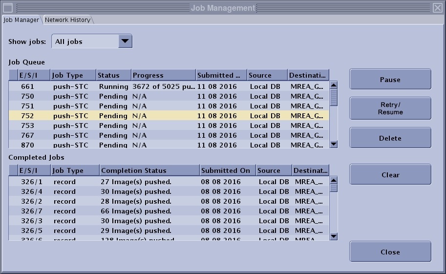 The Job Management feature also provides a history of archive and network events. The list allows you to check and verify that an exam/series/image has been sent to an archive or network node. If an entire exam or series has been selected, only one transfer is executed and one entry is displayed in the queue. If specific series or images have been selected, a separate transfer is executed and a separate entry is displayed for each selection. When saving images to a remote archive device such as a PACS, items queued to be saved remotely will be listed in the Archive Queue under the Remote archive list.