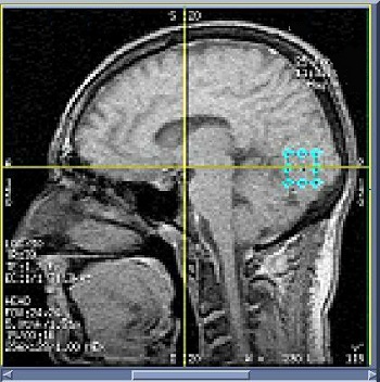 Figure 1. The vertical line represents the coronal slice displayed in the Graphic RX viewport and the horizontal line represents the location of the axial image displayed in the Graphic RX viewport