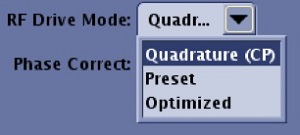 • RF Drive Mode: From the RF Drive Mode menu, select Quadrature when scanning patients with MR Conditional metal implants or devices. In some circumstances, it is the default and only selection. RF Drive Mode only appears if your system configuration supports it.
