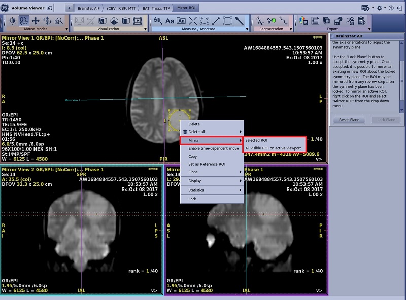 Use these steps to create an axis of symmetry of the anatomy, deposit an ROI on one side of the anatomy, and then propagate the ROI to the exact same location on the other side of the anatomy. This is useful when you want to compare ROI statistics from two locations on either side of an axis of symmetry, for example, left and right side of the brain.