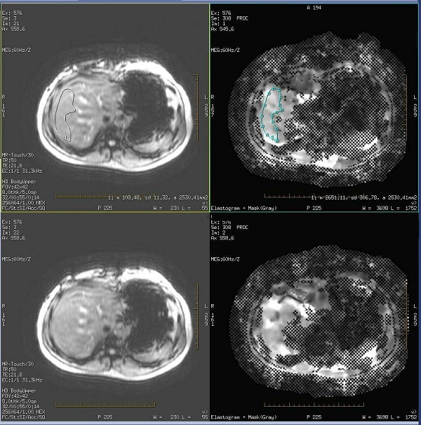 • The masked regions are hash-marked or checkerbox areas that indicate the wave propagation was not sufficient to confidently generate stiffness contrast. Including masked (checkerbox) areas in your ROI will skew the ROI statistics.