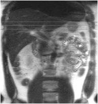 Figure 1. This coronal localizer example displays three axial slices positioned in the middle of the liver