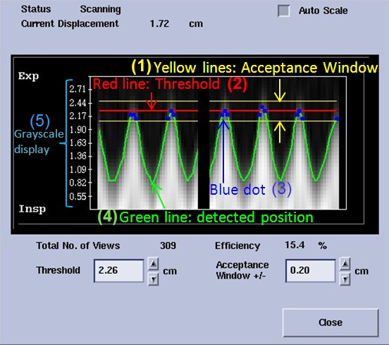 3The blue dot represents acquired signals. Blue dots only occur between the yellow lines. If there is no green line between the yellow Acceptance Window, then no respiratory signal is detected.