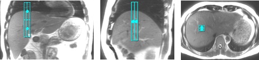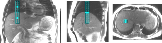 6. Click to deposit the Navigator tracker on the image. On the coronal and sagittal localizer images, position the center tick-mark of the tracker line near the top of right hemi-diaphragm and liver dome.