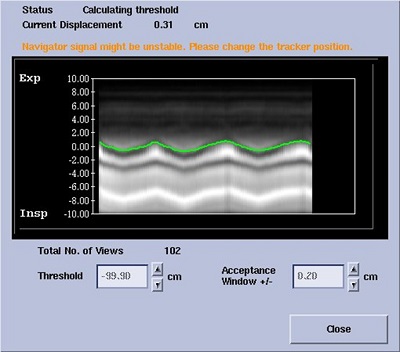 • When the Navigator window opens, the patient’s breathing and diaphragm movement are monitored. The time during which the baseline data is gathered can be set from the Navigator tab, Navigator Prescan Time text field.