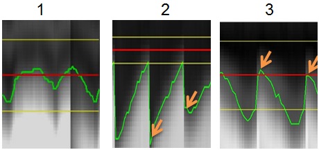 1A bad example. It shows that the green line stays within the Acceptance window during inspiration. Decrease the Acceptance Window or increase the Threshold until the green line goes outside of acceptance window during inspiration.