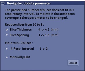 • In multi-slice multi-angle scan prescriptions, it is not possible to keep the coverage with increasing thickness or spacing. The only option is to increase # Respiratory Intervals and Manually Edit.