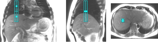 3. Acquire localizer images that include the dome of the liver visualized on the sagittal and coronal images..