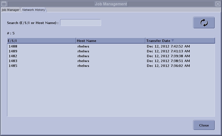The Network History tab lists the jobs that have been transferred. The entries are listed by how the job was queued for transfer, i.e., by exam, series, or image.