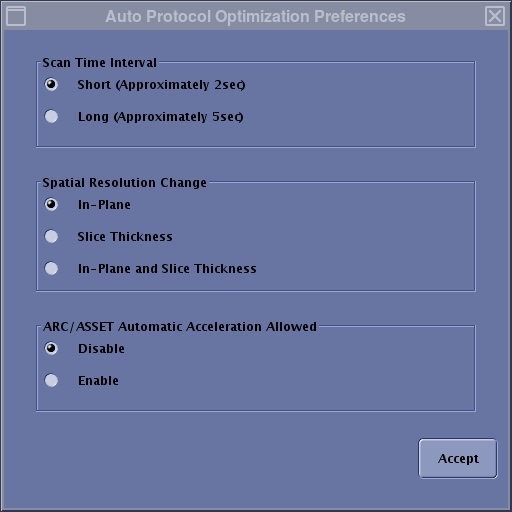 • ARC/ASSET Automatic Acceleration Allowed: When Disable is selected, the algorithm does not control anything for parallel imaging. When Enable is selected, the algorithm controls the Acceleration factors of parallel imaging, even if the parallel imaging option is off in the original protocol. The system controls parallel imaging in the following scenarios: