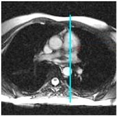 2. From the right ventricular outflow tract view, prescribe (blue line indicates graphic location) and acquire a pulmonary valve view.