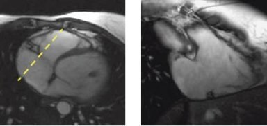 Figure 2. Axial localizer with oblique prescription line (left), oblique coronal of right ventricle (right)