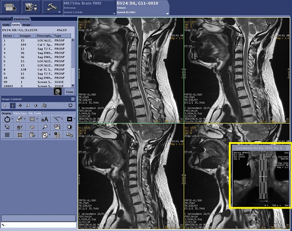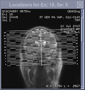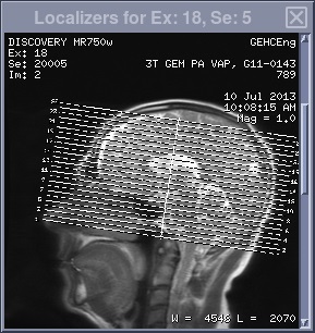 • The scan locations from the selected series are automatically posted in the localizer viewer. Click and drag the image scroll bar to see all images in the localizer series. Note that you can view images in the Localizer viewport when you are selecting a series from the browser.