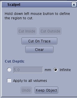 Cut on Trace for a one voxel wide cut along the trace in the 3D volume defined by the trace and cut depth. Use this function, for example, to separate two anatomical features that are touching, or that are connected by a bridge of a few voxels, into two separate 3D objects.