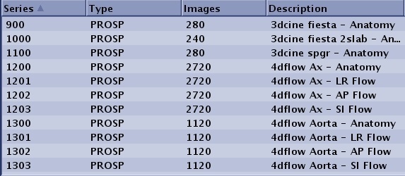 The 4DFLOW series numbering is the number of the preview series multiplied by 100 for the fully reconstructed anatomy series and multiplied by 100 plus 1, 2 and 3 for the Left-Right, Anterior-Posterior and Superior-Inferior flow series, respectively.