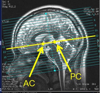 The Ready Brain reference line can be set from the Exam Preference screen before saving the first task or the System Preference screen before starting an exam. Figure 1. The ACPC line extends from the superior surface of the anterior commissure to the center of the posterior commissureFigure 2. The Orbitomeatal line extends from the nasal root through the pontomedullary junction