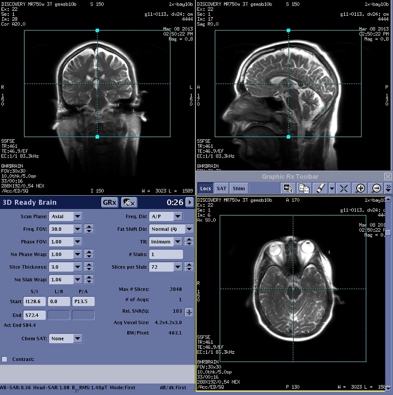 It is critical that you adjust the Slices per Slab or Slice Thickness to cover the entire brain. Figure 3. Example of a Ready Brain 3D localizer