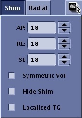 5. Adjust the Shim volume size and type values in the Shim text fields: AP (Anterior Posterior), RL (Right Left) and SI (Superior Inferior).