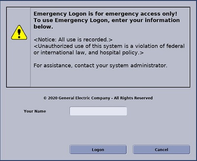 When using Emergency Logon, you are prompted to enter your name, but there is no password. To protect patient health information, only enable Emergency Logon if the operator console room is protected by physical security measures, such as card key access.