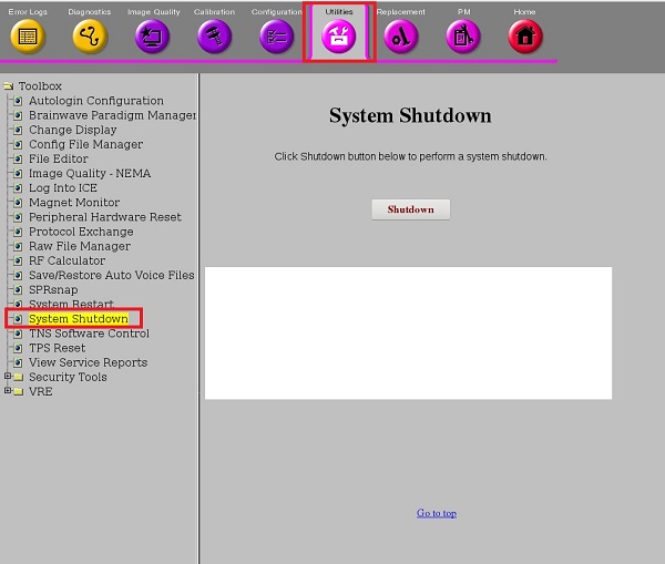 Object ID: 00000018WIA30FB0F80GYZTopic ID: id_40025694 Version: 1.2Date: Jun 23, 2022 3:22:13 AMSystem shutdown About this taskUse these steps to turn off the system in an emergency when you want to skip the 60 minute cool down time.Step-by-step instructionsIn the header area of the screen, click the Tools icon .In the System Management work area, click the Service Desktop Manager tab.In the Service Desktop Manager, click Service Browser.In the MR Service Desktop screen, click the Utilities tab. Figure 1. MR Service Desktop tabs area Select System Shutdown. Figure 2. System Shutdown on Utilities tab Complete the steps in Extended shutdown. To restart the system, follow the steps in Startup from an extended shutdown. Wait 60 minutes after the startup before you start to scan. Not waiting the 60 minutes could impact image quality.