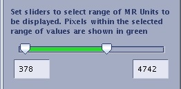 The low and high threshold sliders allow you to define the range of MR values (pixel values) that will be processed by the protocol (shown by green hatching on the image).