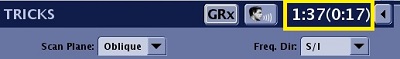 The Rx Scan Time (contrast enhanced phases), mask scan time, and temporal resolution (time interval from one phase to the next phase) values are displayed on the Scan Parameter screen. Figure 2. TRICKS scan parameter screen bar that displays scan time and temporal resolution