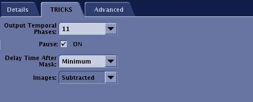 Images menu: TRICKS prescription can acquire subtracted, un-subtracted or both un-subtracted and subtracted images. This may provide additional information in areas where patient motion between the mask image and contrast images degrade image quality or where bony landmarks are required for surgical planning.