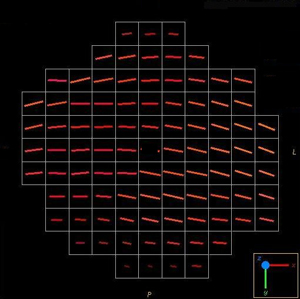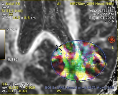 Use these steps to magnify the ROI with a vector displayed in each pixel. The vector color represents the orientation of the white matter in that pixel. Correlate the vector color with the color guide box in the lower-right corner of the viewport.