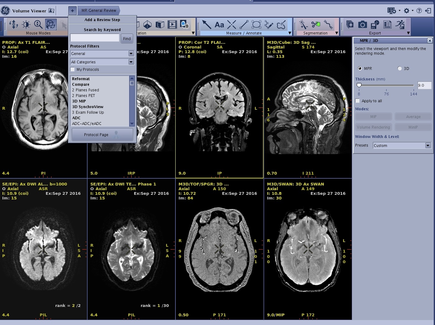 - At any time, you can click MR General Review > Review Step to return to the 8 viewport display and then click another viewport and protocol.